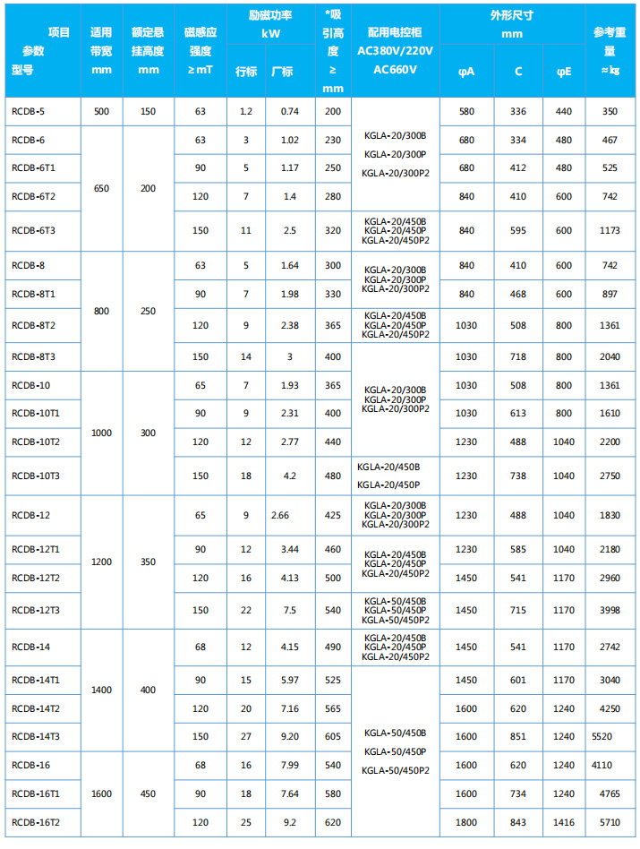 四、RCDB系列懸掛盤式自冷電磁除鐵器主要技術參數、外形尺寸                      執行標準:JB/T7689