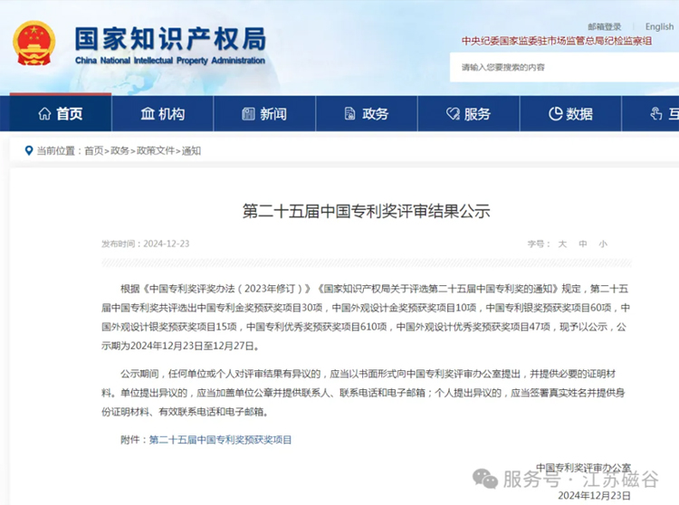 | 喜迎元旦,江蘇磁谷再創佳績——繞組式無刷耦合傳動裝置榮獲中國專利獎優秀獎 | ||